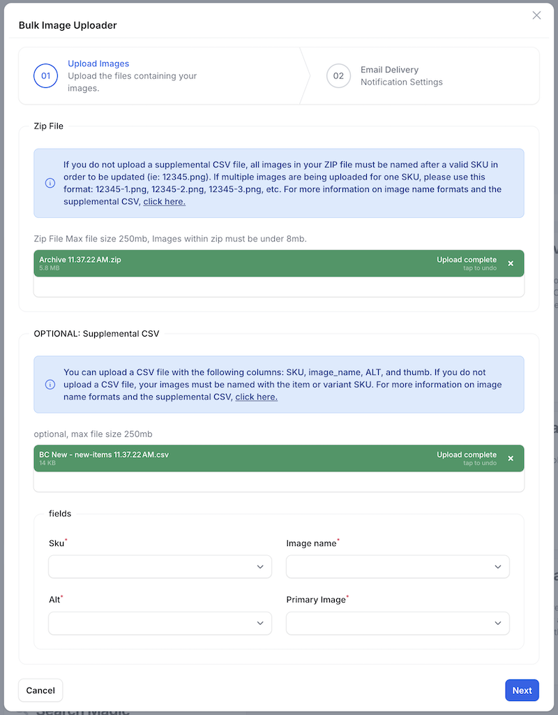 The Bulk Image Uploader tool allows you to upload multiple product images to your Shopify store at once using a ZIP file along with a supplemental file which maps the images to the item’s SKU and allows you to add ALT tags and set a specific image as primary on a SKU.