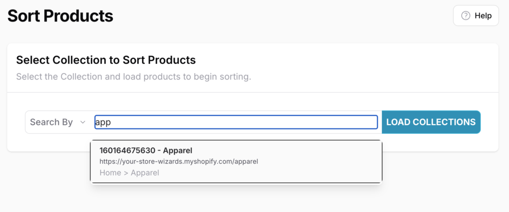 Step 3: Once you find the category you are looking for, click on the Load Collections button. This will load the Collection Sort settings and all the products in that category from Shopify. You can then proceed to either manually drag and drop the products, or you can sort the products by property.
