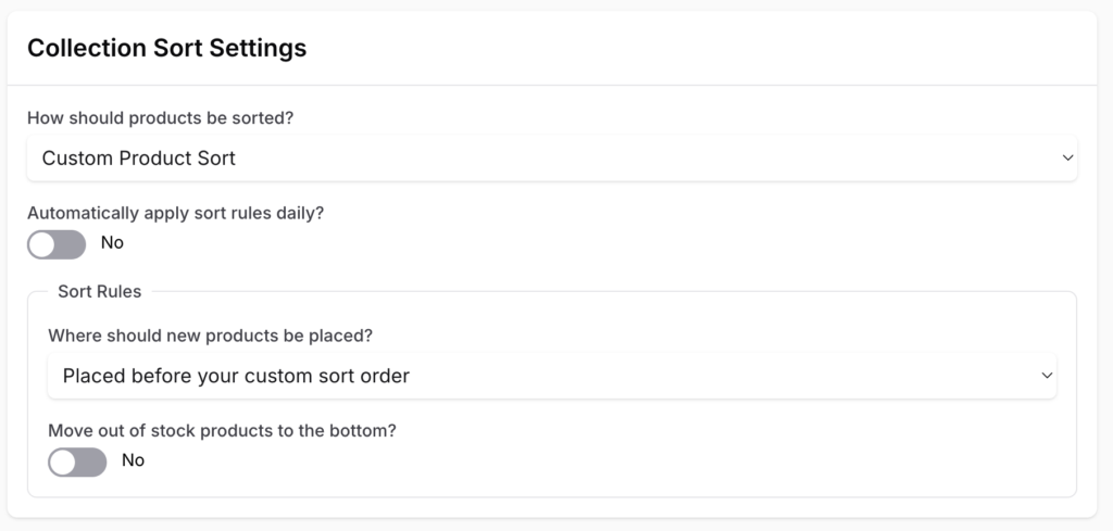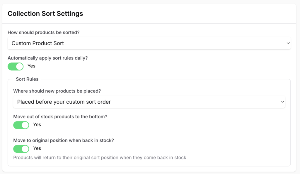 - Move to original position when back in stock? When toggled ON, out-of-stock items that have been moved to the bottom will automatically return to their previous position in the sort when they come back in stock.