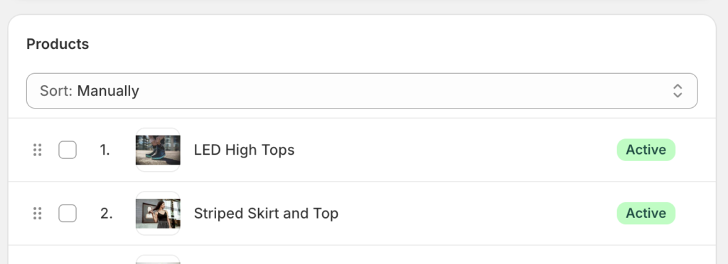 This enables manual drag-and-drop sorting and gives you full control over product placement.