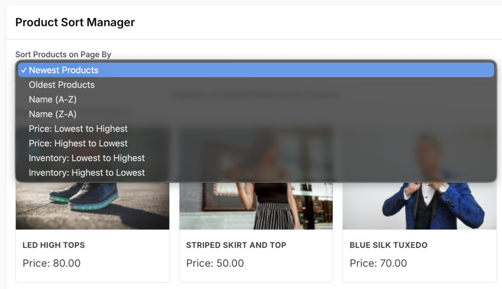 - Select a property-based sort (like Name A-Z) to quickly rearrange all products