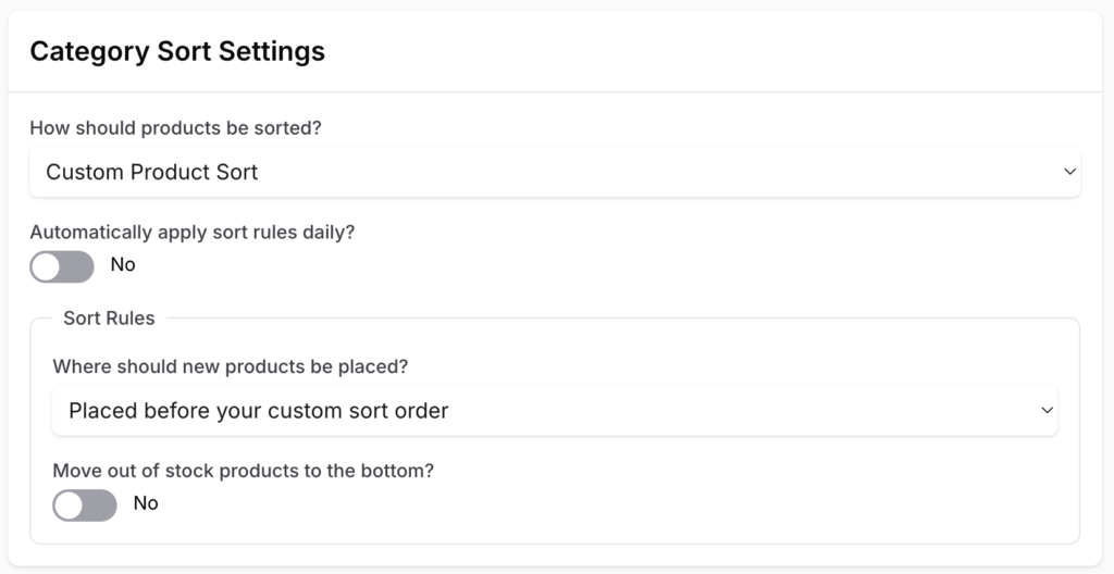 - Move out of stock products to the bottom? When toggled ON, Magic Sorter will automatically move any out-of-stock items to the bottom of the page. This is useful for showing shoppers only in-stock items while they're browsing.
