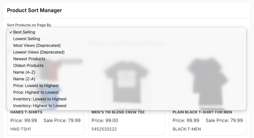 - Select a property-based sort (like Name A-Z) to quickly rearrange all products