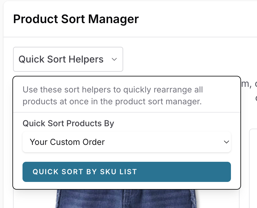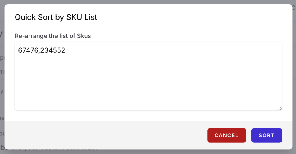 Click the Quick Sort by SKU List button to paste a comma-separated list of SKUs. Products will be arranged in that exact order. This is useful when you have a specific merchandising plan or want to match an external system's order.
