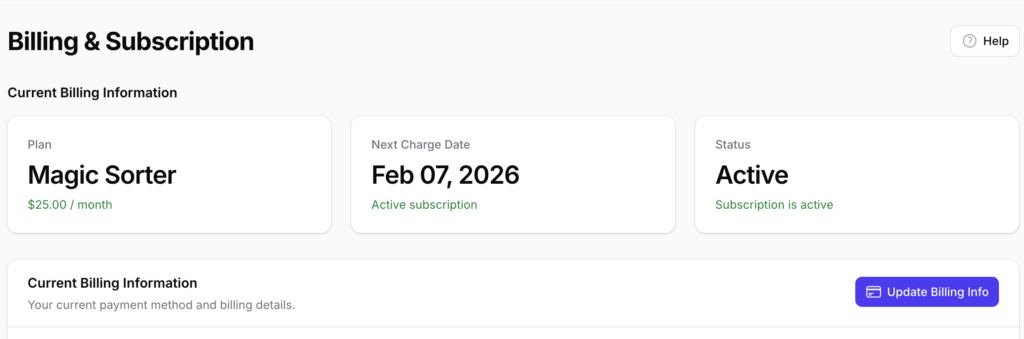 To change the credit card associated with your monthly subscription to Magic Sorter, click on Billing from the dashboard: