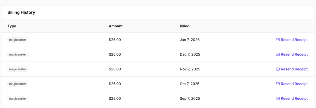 To view billing history and to resend a invoice for Magic Sorter, click on Billing from the dashboard: